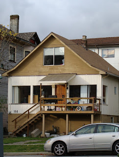 And lo, across the street is this example of what harm you can do to a house when you slap on some bad siding and ugly slider windows. These two are neighbours - same house, two different ... styles. Yikes.